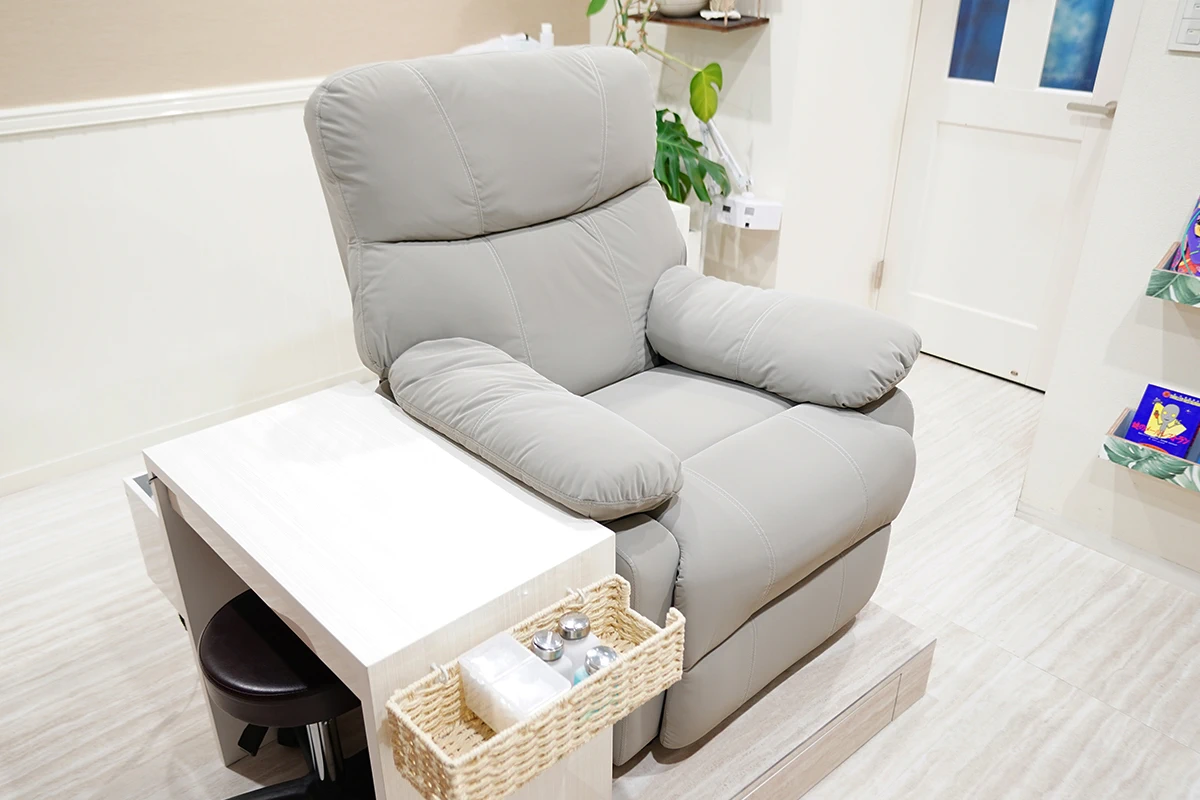 また、リクライニング可能なソファを設置し、お客様一人ひとりがくつろぎながら施術を受けられるよう工夫しております。プライベートサロンならではの落ち着きと、特別感あふれるひとときをお楽しみください。